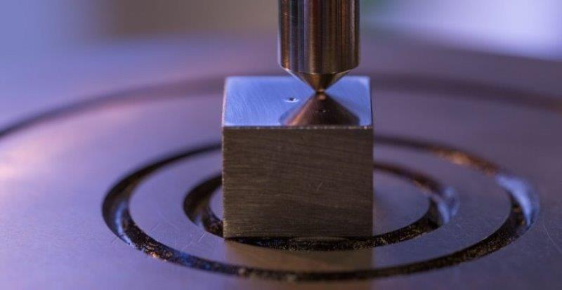 O teste de Dureza Rockwell mede a profundidade de penetração de um penetrador sob uma carga pesada, em comparação com a penetração causada por uma carga preliminar (pré-carga). A Escala C da Rockwell utiliza especificamente um penetrador em forma de cone de diamante. O teste começa com a aplicação de uma carga menor para posicionar o penetrador, seguida pela carga principal. A profundidade da marca é então medida, e o valor HRC é determinado. Este método é rápido, fácil de aplicar e exige pouca preparação da amostra, sendo amplamente utilizado em ambientes de controle de qualidade e produção. É indicado especialmente para materiais mais duros, como o aço e outros metais.