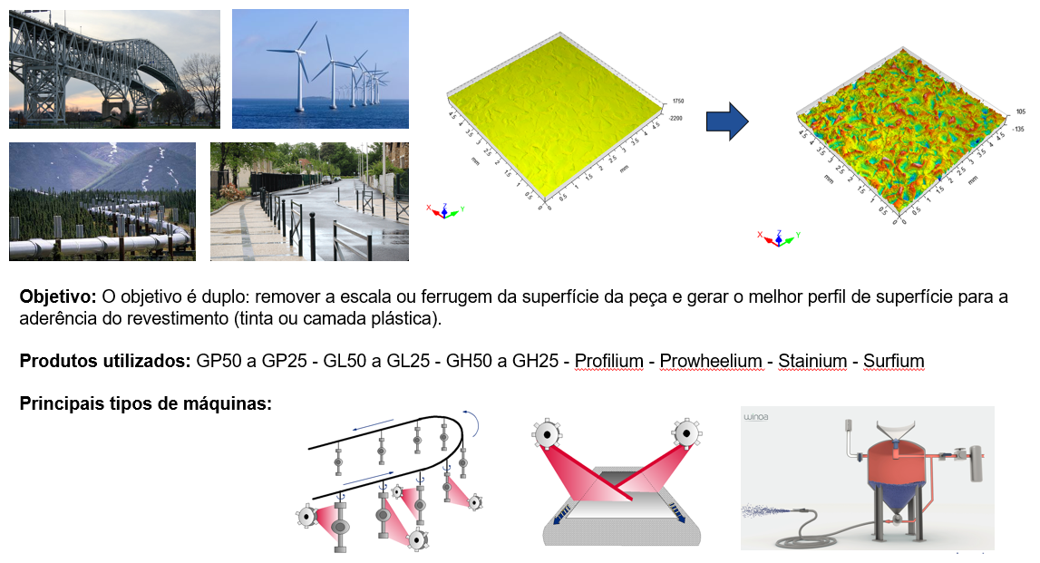 A preparação de superfície na metalurgia tem um duplo objetivo: remover a escala ou ferrugem da peça metálica e gerar o perfil de superfície mais adequado para a aderência do revestimento. Essa preparação é essencial para a aplicação de tinta ou uma camada plástica, garantindo durabilidade e longevidade do revestimento.